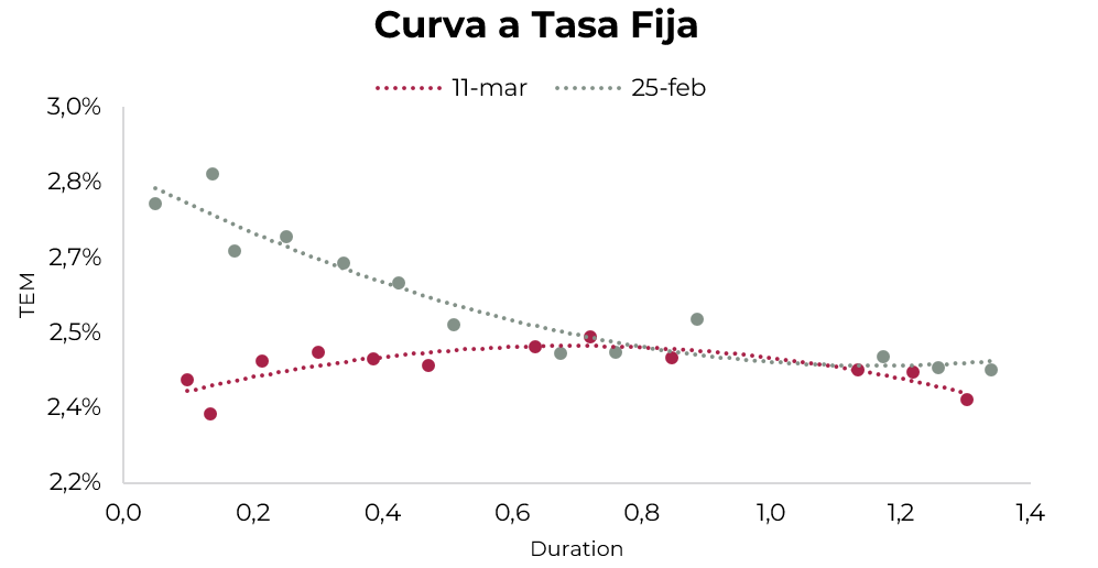 La compresión de tasas en el tramo corto de la curva observada tras la licitación del 25/02, que hoy se ubica en el rango de 2,3%-2,4% TEM, sugiere que el mercado podría exigir tasas más altas. Contemplando que la inflación de febrero se ubicaría en torno al 2,6% m/m, recomendamos licitar la Lecap de mayo (S15Y6). Por otro lado, la Letamar M31G6 (TAMAR +2,2%) puede ser una buena alternativa teniendo en cuenta su devengamiento actual del 3% TEM, que supera el rendimiento de su par a tasa fija.