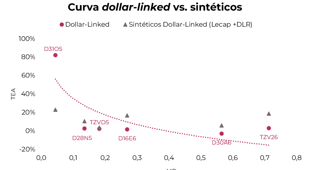 Bajo este escenario, dentro de las estrategias en pesos privilegiamos el posicionamiento en instrumentos dollar-linked de corto plazo. Resultan especialmente atractivos tras las intervenciones del BCRA vendiendo estos títulos en el mercado secundario, lo que los dejó relativamente baratos –con los tramos más cortos rindiendo un spread superior al 2%– en un contexto de fuerte demanda de cobertura cambiaria. En particular, destacamos el D31O5 (devaluación +80%), que descuenta una devaluación implícita de tan solo 0,4% hacia fines de octubre, y el TZVD5 (devaluación +3%), que descuenta una devaluación implícita del 11% hacia fin de año. Asimismo, la cobertura mediante contratos de futuros de dólar a enero surge como una buena alternativa: los precios descuentan una devaluación implícita del 15% con un costo de cobertura relativamente bajo (46,6% TNA) frente al rendimiento de una Lecap al mismo plazo (64,7% TNA), lo que habilita estrategias sintéticas dollar-linked.