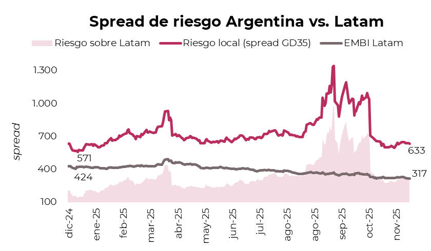 Esa discusión gana relevancia al observar que, pese a un clima financiero más ordenado, la corrección del riesgo país fue acotada. Desde la publicación a fines de octubre de nuestro informe Nuevo Punto de Partida, en el que analizábamos el margen de compresión de la prima local en función del riesgo LatAm, el riesgo país argentino retrocedió apenas de 685 pb a la zona de 640 pb. En paralelo, el spread frente al índice regional se mantiene en torno a los 320 pb, muy por encima de los 150 pb registrados en enero, cuando la convergencia se acercó a los mínimos del año. Es decir, aun con un frente político más sólido y un entorno local más estable, la brecha no sólo se mantiene elevada, sino que continúa duplicando los mínimos de principios de año.