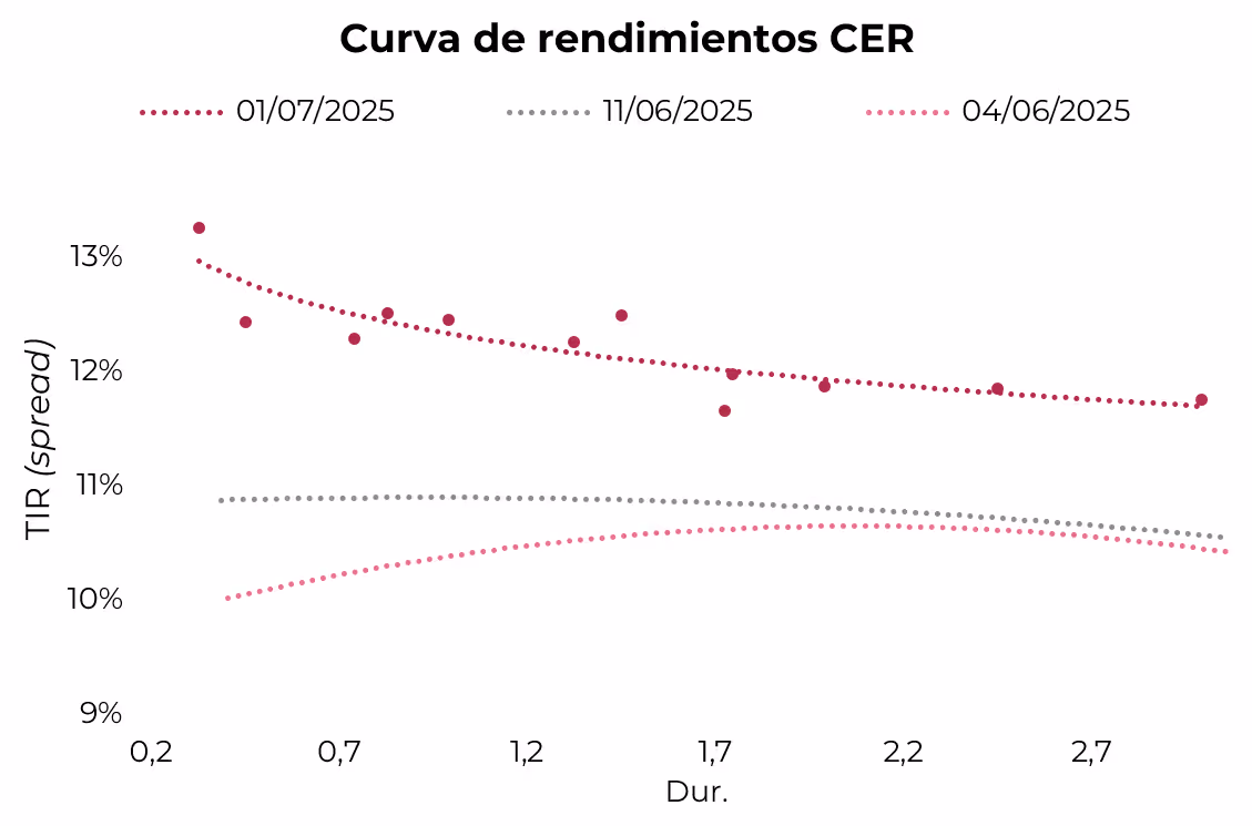 En cuanto a los bonos CER, la desaceleración de las expectativas de inflación en el corto plazo, junto con la suba de rendimientos en la curva a tasa fija, impulsó un ajuste al alza en las tasas reales. Esto se tradujo en una marcada descompresión a lo largo de la curva CER, cuyos rendimientos pasaron de CER +10% a comienzos de junio a niveles cercanos a CER +11,5% en la actualidad.
