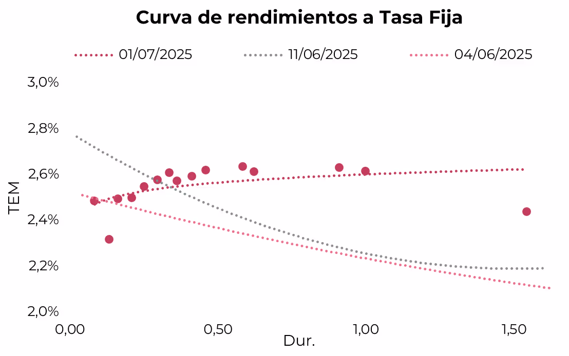 En tanto, el tramo largo, que a principios de junio promediaba un rendimiento de 2,2% TEM (30,6% TEA), ajustó al alza mostrando rendimientos del 2,6% TEM (35,8% TEA). Así, a los precios actuales, la curva a tasa fija presenta una pendiente aplanada, producto de la compresión de rendimientos en el tramo corto y la suba de rendimientos en el tramo largo.