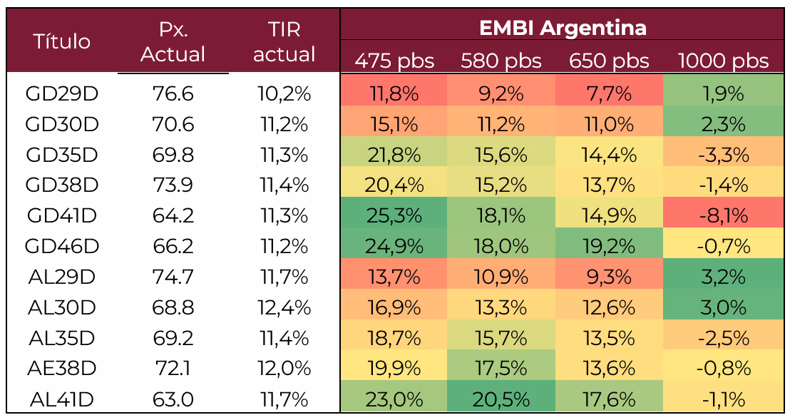 Para estrategias en dólares, mantenemos la preferencia por el tramo medio-largo de la curva de bonos soberanos. Si bien la acumulación de reservas continúa siendo el pilar más débil del programa, creemos que un ancla fiscal sostenida y un triunfo del oficialismo en las elecciones legislativas de octubre podrían habilitar una compresión del riesgo país que permita reabrir el acceso a los mercados internacionales. En este contexto, destacamos el GD35 (TIR 11,4%) y el GD41 (TIR 11,3%) por su capacidad de captar el mayor upside potencial ante distintos escenarios de caída en el riesgo país en un horizonte de un año. Además, el rendimiento corriente de estos instrumentos se ubica en 5,9% y 5,5%, respectivamente, muy por encima del rendimiento corriente que ofrece el tramo corto de la curva.