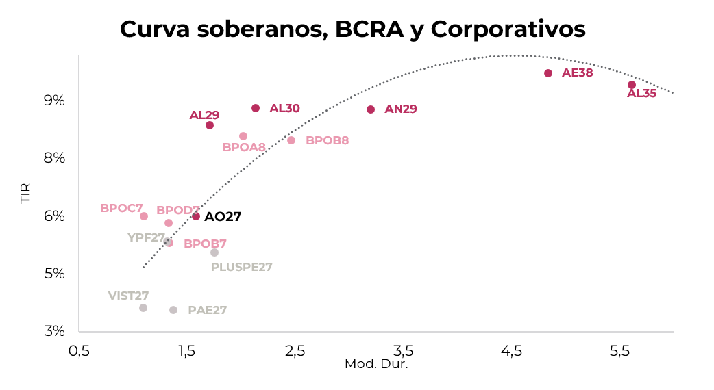 Desde el punto de vista relativo, el A027 satisface la demanda del mercado en un tramo de la curva donde la oferta es limitada. El AL30, por ejemplo, exhibe una modified duration de 2,14 y un vencimiento posterior al actual mandato, que compara con la modified duration de 1,58 del nuevo Bonar. En tanto, en el tramo corto de la curva de corporativos ley local se observan rendimientos promedio de 4,4%, por debajo de lo que ofrece el A027. En cuanto a los BOPREAL, si bien el Serie 1-C cuenta con una modified duration similar, su retorno es levemente inferior y el cupón del 5% anual se paga de manera semestral, frente a la frecuencia mensual que ofrece el Bonar.
