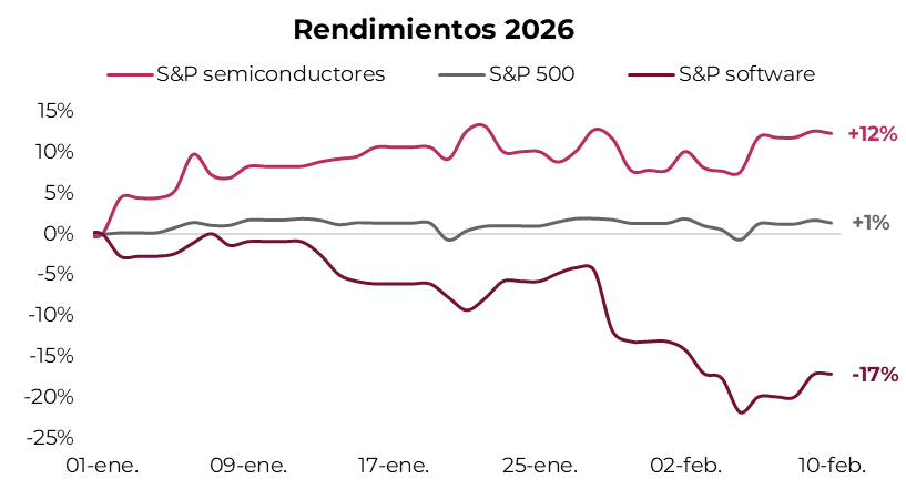 Las compañías de software del S&P 500 acumulan una caída del 17% en lo que va de 2026 y del 26% desde los máximos alcanzados el 28 de octubre pasado. En cambio, el índice S&P 500 gana 1% en el año y el sector de semiconductores sube 12%.