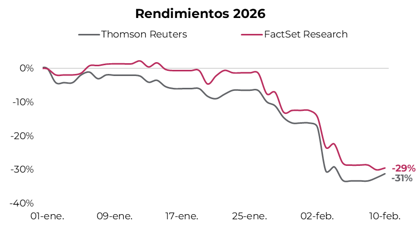 De forma similar, plataformas de análisis financiero como Thomson Reuters y FactSet Research acumulan caídas cercanas al 30% en 2026, ante el temor de que sus servicios, o al menos su poder de fijación de precios, enfrenten presión competitiva por parte de nuevas herramientas de IA capaces de generar análisis automatizados.