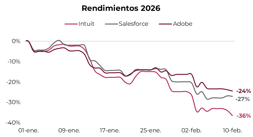 Dentro del universo software, la corrección golpeó especialmente a compañías consolidadas como Intuit (especializada en soluciones de gestión financiera y contabilidad), Salesforce (líder en software de gestión de relaciones con clientes) y Adobe (referente global en herramientas de diseño digital y creación de contenidos).
