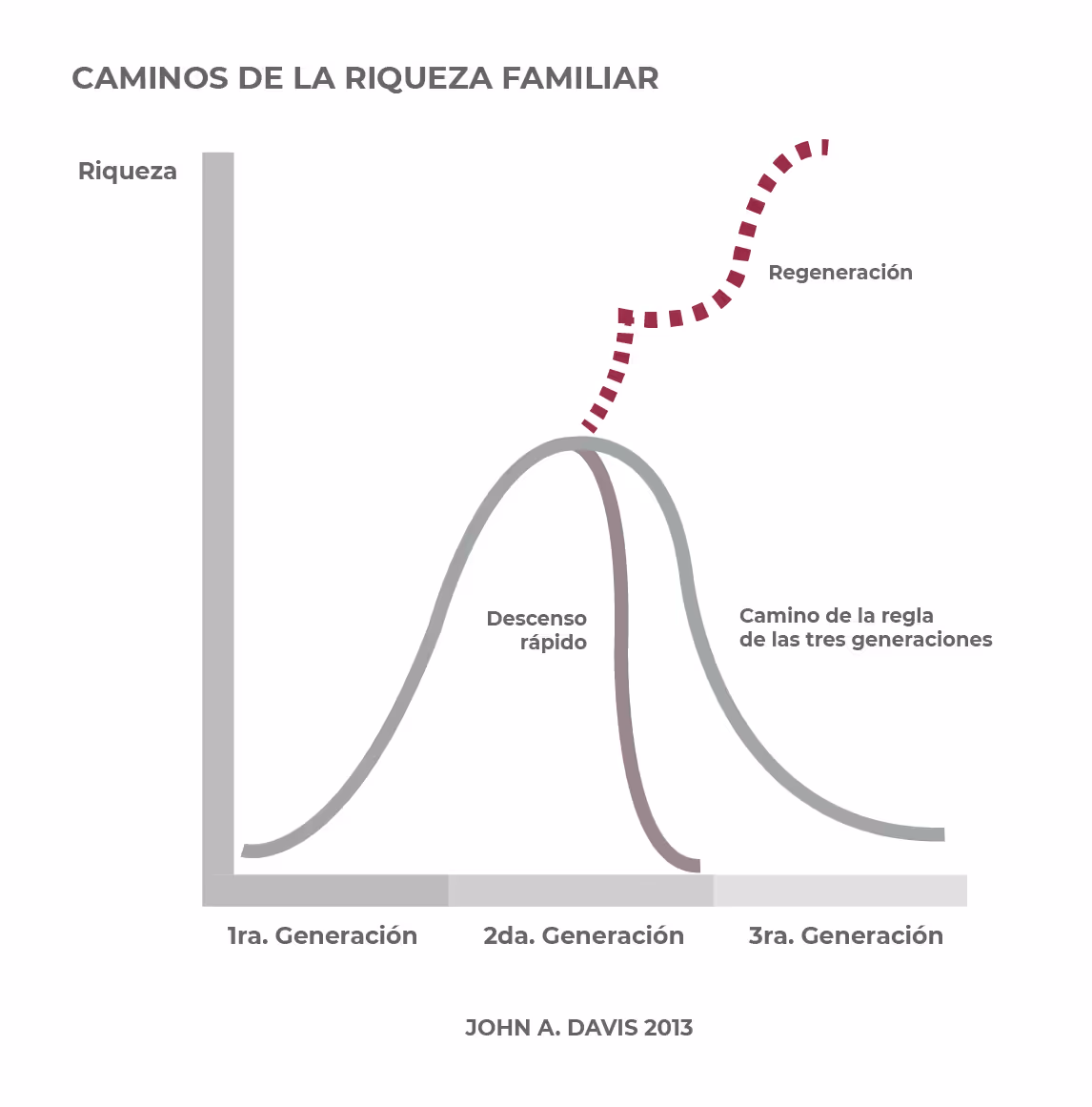 “El objetivo final de una empresa familiar no es solo transferir el negocio, sino también una familia unida y comprometida” (John A. Davis, experto en empresas familiares). El especialista, habla sobre la Regla de las Tres Generaciones. En ella, la riqueza tiende a crecer rápidamente en una sola generación, ya sea en la generación fundadora o en una de las primeras generaciones y luego toma uno de los siguientes tres caminos. El camino de declive gradual, donde el patrimonio se consume más rápido de lo que se genera, o el negocio no se adapta a los cambios en la industria. El segundo camino, conocido como el camino de descenso acelerado, además de las causas anteriores hay apuestas riesgosas fallidas o conflictos patrimoniales que erosionan los activos. Por último, las familias que logran preservar y hacer crecer su patrimonio a lo largo de las generaciones transitan el camino de la regeneración. Estas familias adoptan principios y prácticas estratégicas orientadas a la creación sostenida de valor mediante talento, unidad, misión compartida, diversificación y control del estilo de vida.