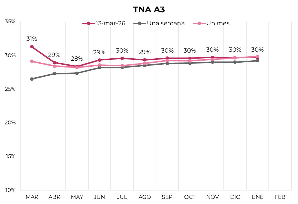 La tasa implícita de marzo mostró un alza hasta 31% TNA, desde 27% TNA en la semana anterior. Para los meses de abril y mayo cerró en 29% y 28%, respectivamente, que también comparan contra el nivel de 27% de la semana previa. En tanto, el resto de la curva se desplazó hacia un nivel de 30% TNA, desde 28% TNA.