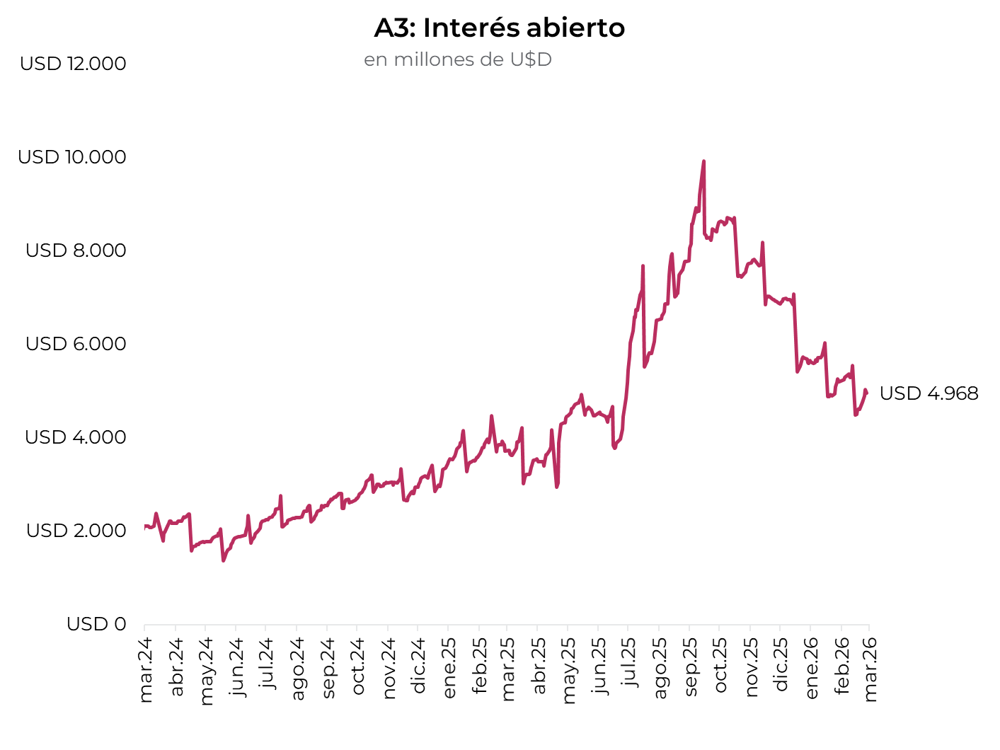 El volumen operado aumentó y en las últimas cinco ruedas se comerciaron USD 5.605 M. El viernes 13 de marzo el interés abierto cerró en USD 4.968 M, mostrando una caída de 5% m/m y una suba de 33% a/a.