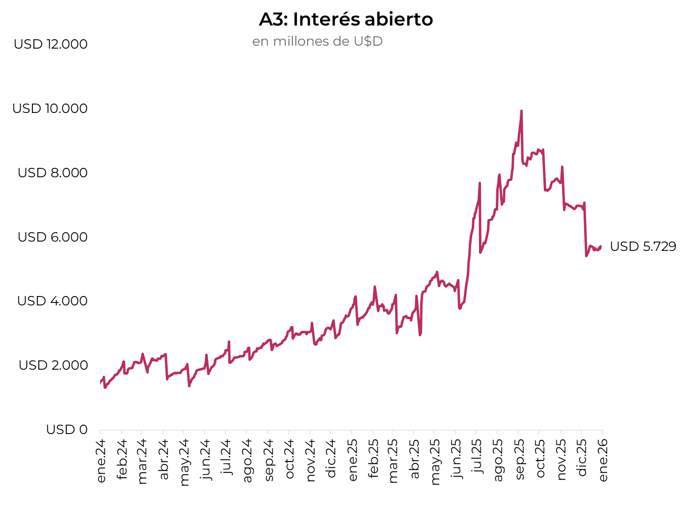 El volumen operado aumentó, aunque se mantiene en niveles inferiores al segundo semestre de 2025. En las últimas cinco ruedas se comerciaron USD 3.012 M. El viernes 23 de enero el interés abierto cerró en USD 5.729 M, mostrando una caída de 18% m/m y una suba de 52 a/a.