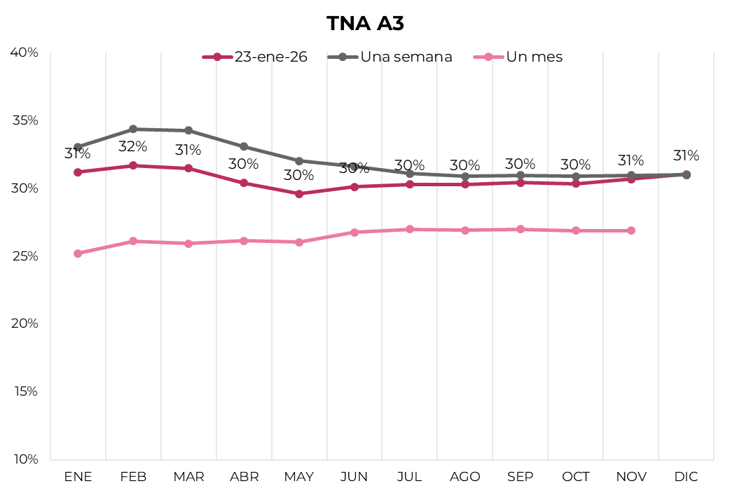 Las tasas implícitas mostraron leves caídas en todos los tramos, y se mantienen por debajo de la curva de Lecap. Concretamente, la curva muestra una pendiente levemente negativa desde enero hasta mayo, con rendimientos entre 31% y 30%. Desde allí, muestra una pendiente plana del 30% hasta diciembre.