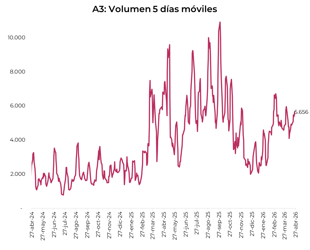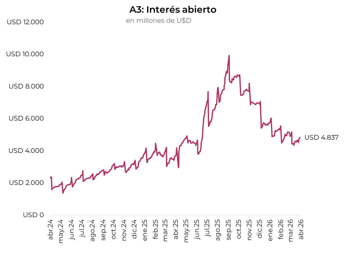 El volumen operado subió, y en las últimas cinco ruedas se comerciaron USD 4.837 M. El viernes 24 de abril el interés abierto cerró en USD 5.656 M, mostrando una caída de 6% m/m y un alza de 32 a/a.