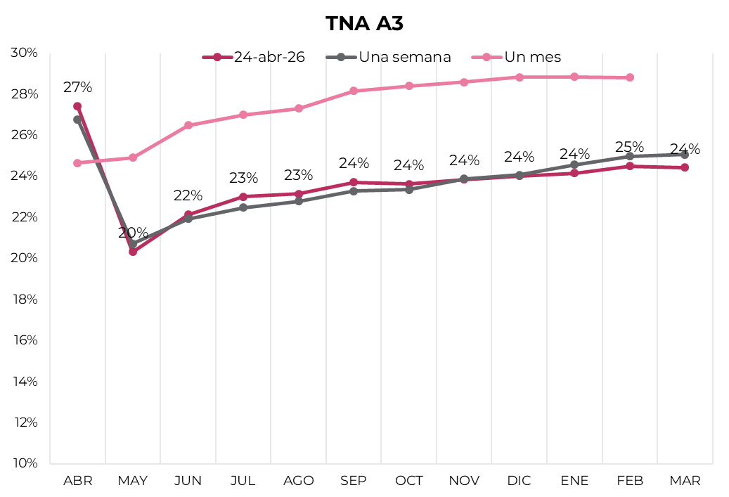 La curva de tasas implícitas no mostró variaciones respecto de la semana anterior. Para el mes de abril cerró en un nivel de 27% TNA, mientras que mayo y junio cerraron en 20% TNA y 22% TNA, respectivamente. El resto de la curva aumenta gradualmente hasta 24% TNA.