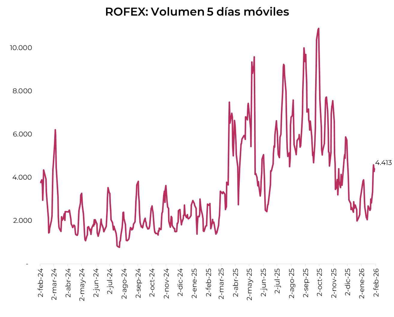 El volumen operado subió hasta niveles no vistos desde finales de noviembre. En las últimas cinco ruedas se comerciaron USD 4.413 M. El viernes 30 de enero el interés abierto cerró en USD 6.038 M, mostrando una suba de 11% m/m y de 45% a/a.
