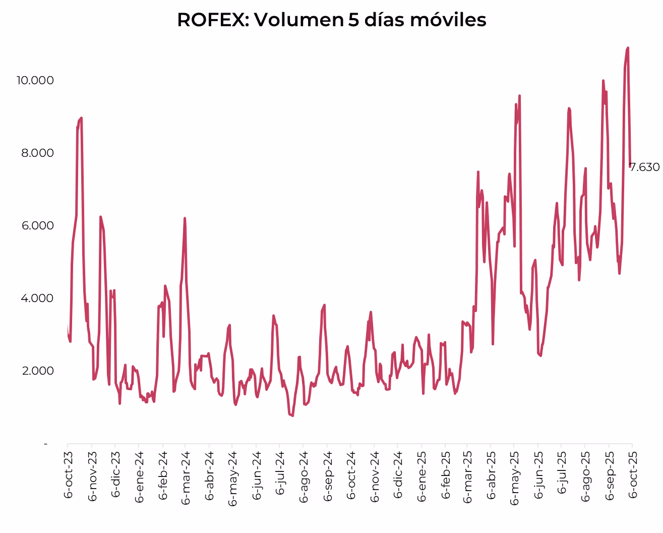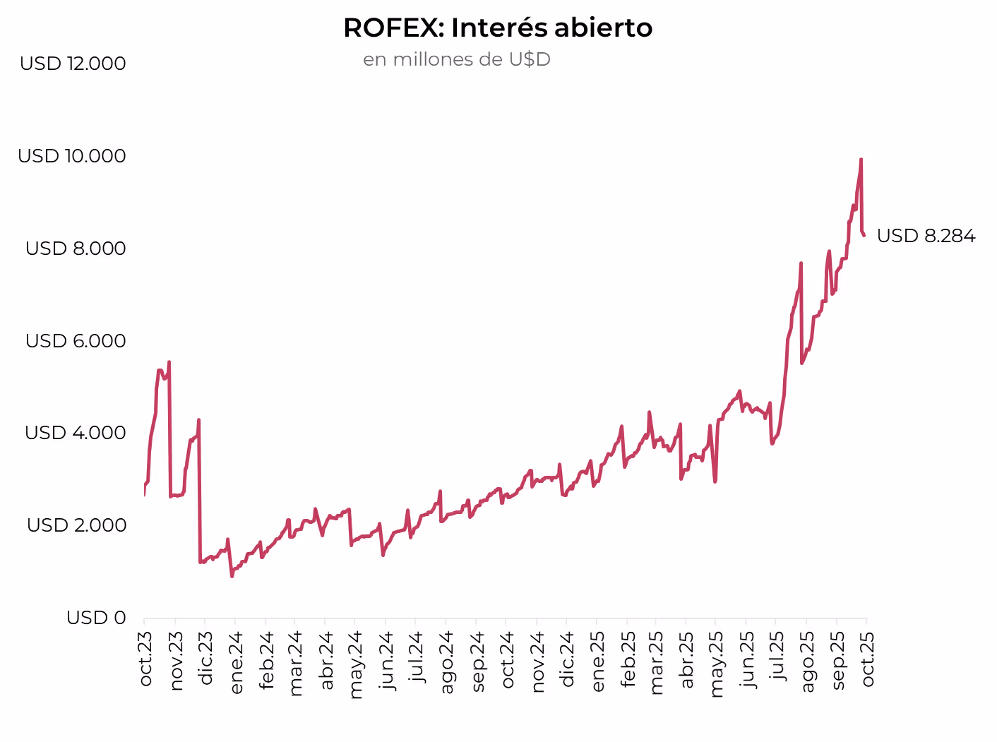El volumen operado retrocedió frente a la semana anterior. En las últimas cinco ruedas se comerciaron USD 7.630 M. El viernes 3 de octubre el interés abierto cerró en USD 8.284M, nuevo máximo del año, mostrando una suba de 17% m/m y 209% a/a.