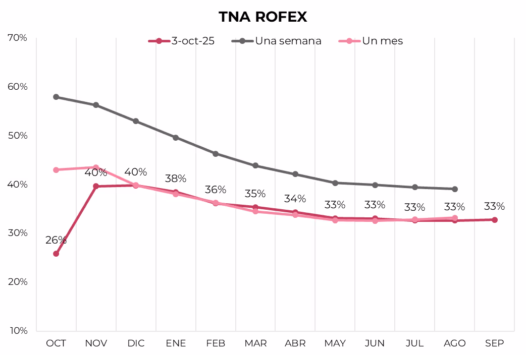 La curva de tasas (TNA) se contrajo en todos sus tramos. De octubre a noviembre sube de 26% a 40%, para caer gradualmente a 33% en septiembre de 2026.