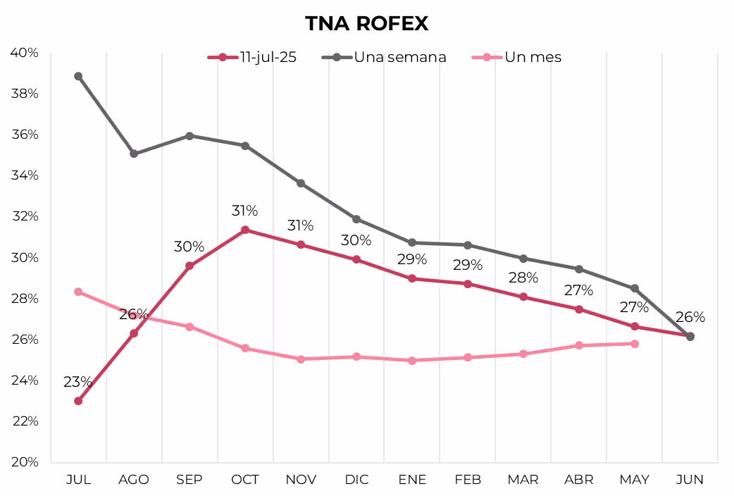 A raíz del desarme de LEFIs y de una mayor liquidez de pesos en el mercado, la curva de tasas (TNA) comprimió fuertemente en el tramo corto. De julio a octubre muestra una pendiente positiva que sube desde 23% a 31%, desde allí cae gradualmente a 26% en junio 2026.