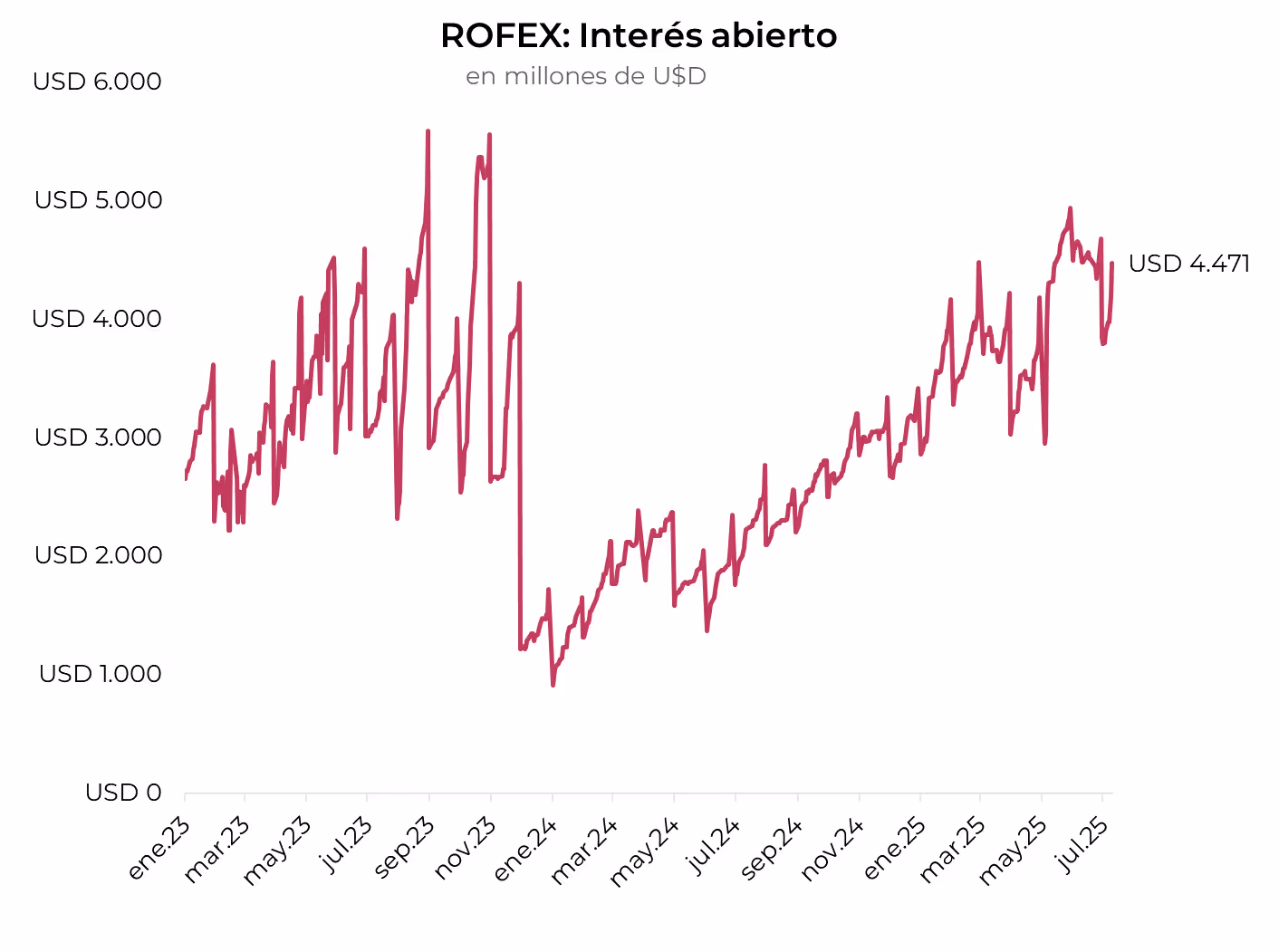 El volumen operado se incrementó frente a la semana anterior. En las últimas cinco ruedas se comerciaron USD 6,89 M. El viernes 11 de julio el interés abierto cerró en 4,47 millones de contratos, mostrando un alza de 101% a/a.