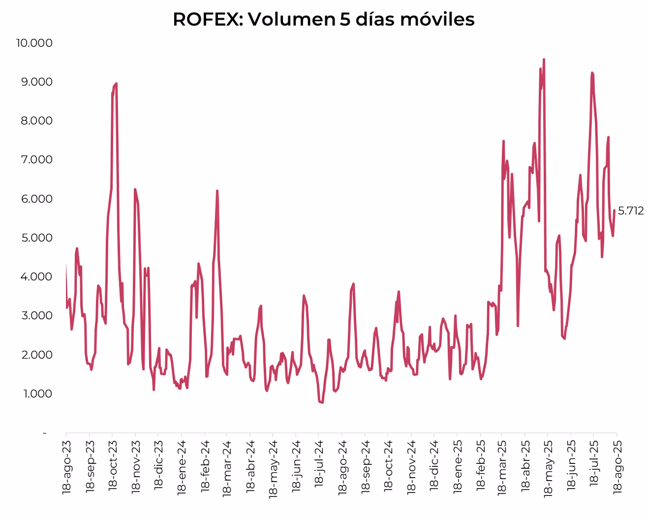 El volumen operado aumentó levemente frente a la semana anterior. En las últimas cinco ruedas se comerciaron USD 5.712 M. El jueves 14 de agosto el interés abierto cerró en USD 6.533M, mostrando un alza de 26% m/m y de 185% a/a.