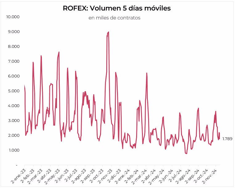 El volumen operado mostró una leve caída. En los últimos cinco días hábiles se comerciaron 1,8 millones de contratos. El viernes 8 de noviembre el interés abierto cerró en USD 3.049 M, una suba de 12% m/m y de -6% a/a.