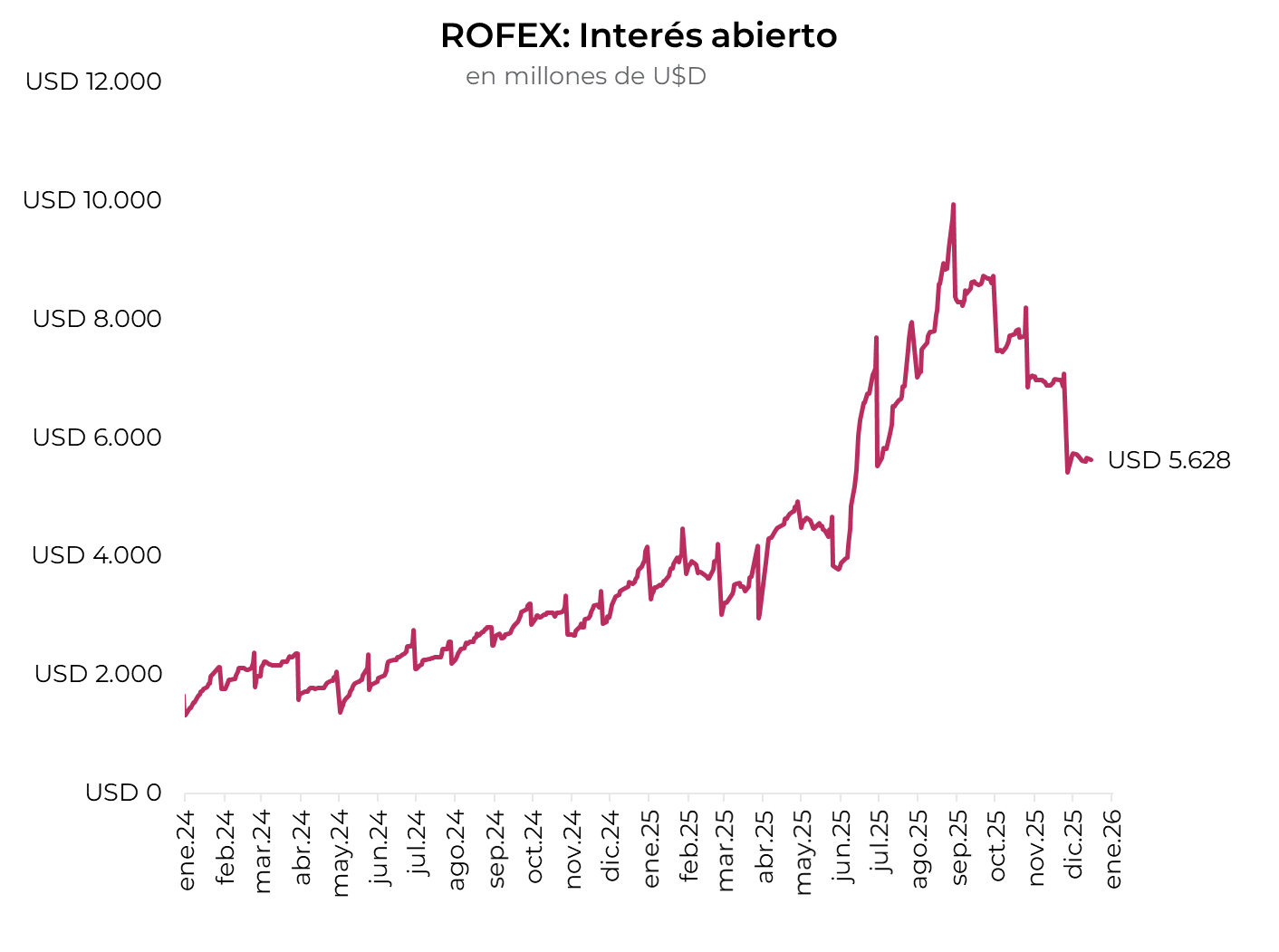 El volumen operado cayó nuevamente, manteniéndose en niveles inferiores al segundo semestre de 2025. En las últimas cinco ruedas se comerciaron USD 2.687 M. El viernes 16 de enero el interés abierto cerró en USD 5.628 M, mostrando una caída de 19% m/m y una suba de 58 a/a.
