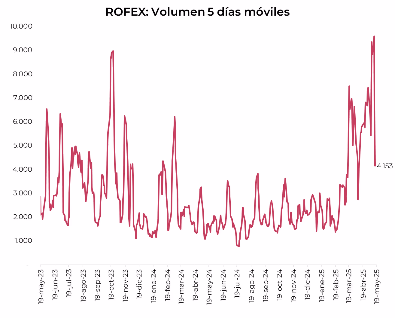 El volumen operado mostró un fuerte retroceso. En las últimas tres ruedas se comerciaron USD 4,1 M. El viernes 16 de mayo el interés abierto cerró en 4.482 millones de contratos, mostrando una suba de 28% m/m y de 150% a/a.
