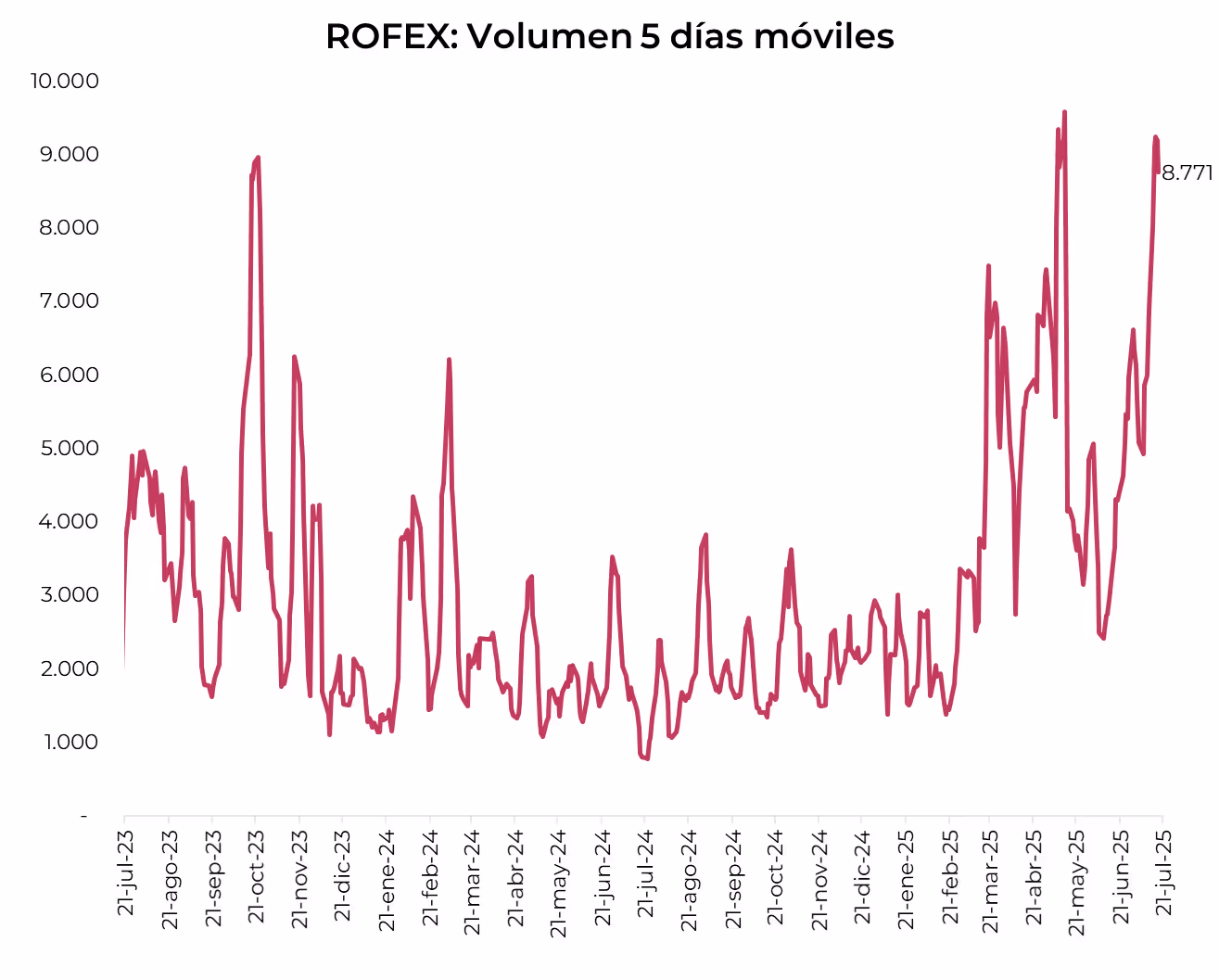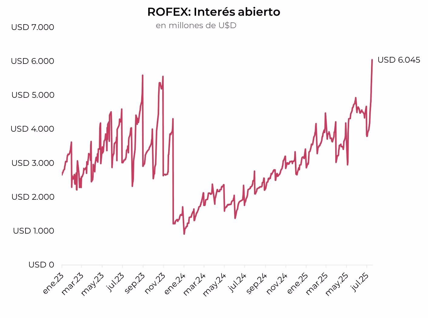 El volumen operado subió frente a la semana anterior. En las últimas cinco ruedas se comerciaron USD 8.771 M. El viernes 18 de julio el interés abierto cerró en USD 6.045 M, mostrando un avance de 34% m/m y de 162% a/a. El interés abierto superó los niveles máximos de fines de 2023, con la mayor suba en el contrato de julio, señal de que el Central podría estar interviniendo en futuros.