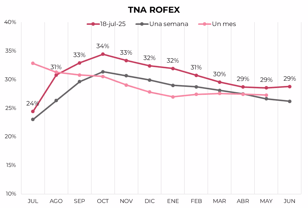 La curva de tasas (TNA) registró alzas en todos sus tramos, aunque se ubica por debajo de la curva de Lecap. Concretamente, de julio a octubre, la tasa sube de 24% a 34%, para luego caer gradualmente a 29%.