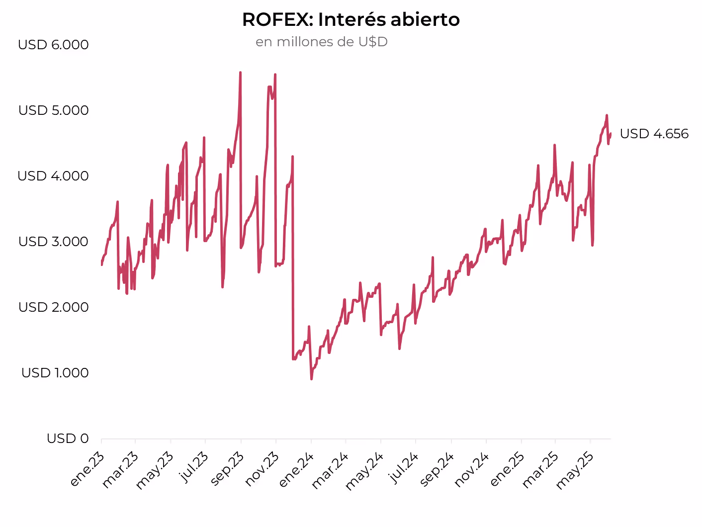 El volumen operado subió de USD 2,9 M a USD 3 M en las últimas tres ruedas. El jueves 19 de junio, el interés abierto cerró en 4.512 millones de contratos, observando una caída del 3% m/m y una suba de 134% a/a.
