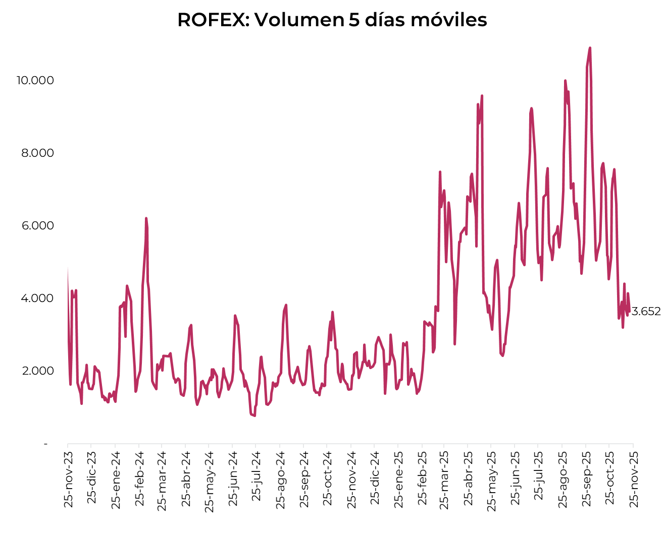 El volumen operado cayó levemente frente a la semana anterior. En las últimas cinco ruedas se comerciaron USD 3.652 M. El jueves 20 de noviembre el interés abierto cerró en USD 7.828M, mostrando una baja de 9% m/m y una suba de 162 a/a.
