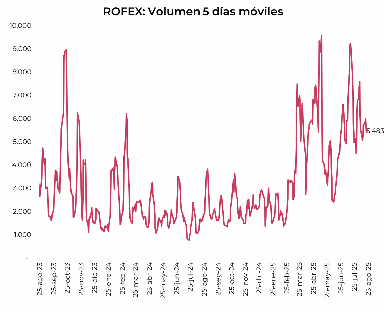 El volumen operado cayó levemente frente a la semana anterior. En las últimas cinco ruedas se comerciaron USD 5.483 M. El viernes 22 de agosto el interés abierto cerró en USD 6.873M, mostrando una suba de 4% m/m y de 182% a/a.