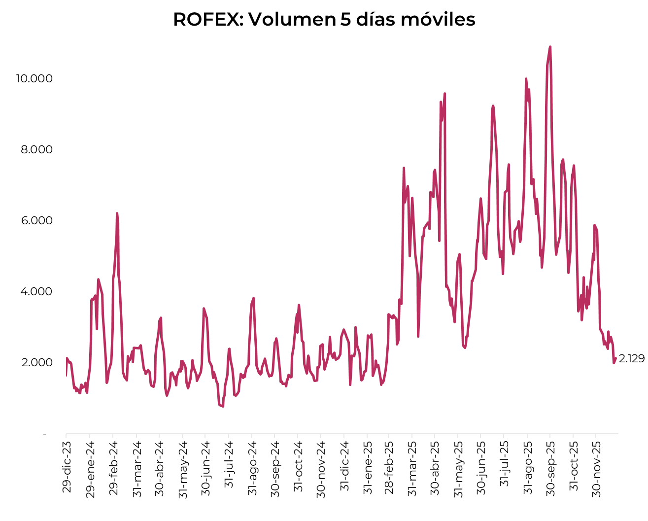 El volumen operado se redujo frente a la semana anterior. En las últimas cinco ruedas se comerciaron USD 2.129 M. El viernes 26 de diciembre el interés abierto cerró en USD 6.970 M, mostrando una caída de 10% m/m y una suba de 116 a/a, con fuertes bajas en el contrato de diciembre.