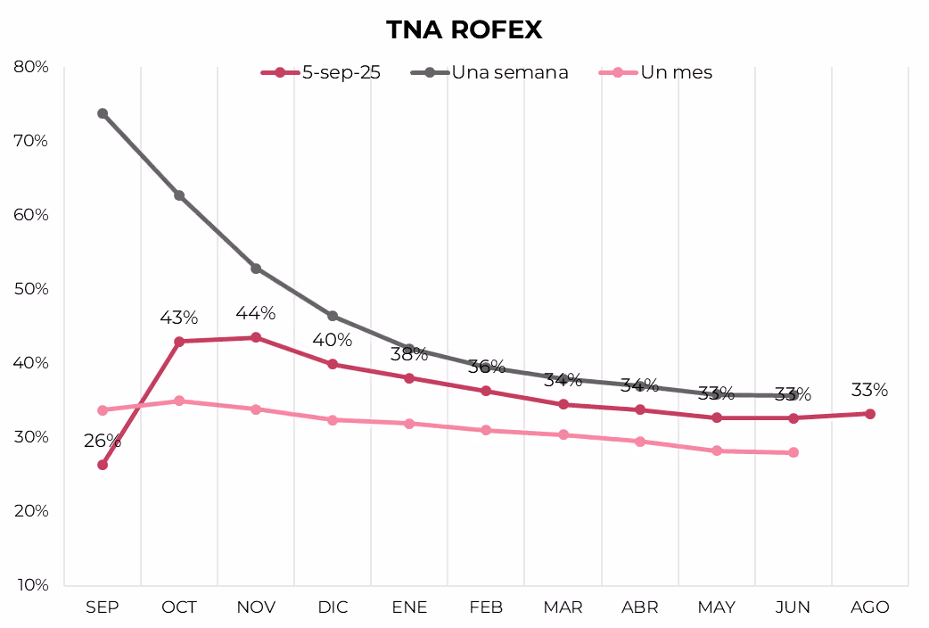 Demanda de cobertura. En la previa a las elecciones en PBA prevaleció la demanda de cobertura. Los futuros de dólar en A3 subieron 0,4%, impulsados principalmente por los contratos de enero y febrero, que avanzaron 1,1% en promedio y se ubican por encima de la banda superior, al tiempo que los contratos de septiembre y octubre retrocedieron en torno al 1%. Tanto el volumen operado como el interés abierto bajaron respecto de la semana anterior: el volumen promedio cayó a 1,4 M de contratos y el interés abierto promedió USD 7.160 M frente a los USD 7.582 M de la semana previa. Las tasas implícitas volvieron a cerrar por debajo de las tasas de las Lecaps: 37% TNA en septiembre, 48% TNA en octubre y noviembre, para luego descender gradualmente hasta 34% TNA en julio de 2026. La curva descuenta una devaluación mensual de 3,1% en septiembre, 4% en promedio entre octubre y noviembre y 2,7% en promedio en 2026.