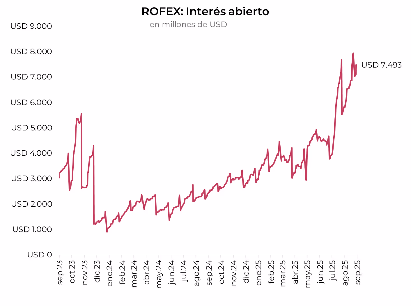 El volumen operado cayó fuertemente frente a la semana anterior. En las últimas cinco ruedas se comerciaron USD 7.030 M. El viernes 5 de septiembre el interés abierto cerró en USD 7.493M, mostrando un alza de 28% m/m y 207% a/a.