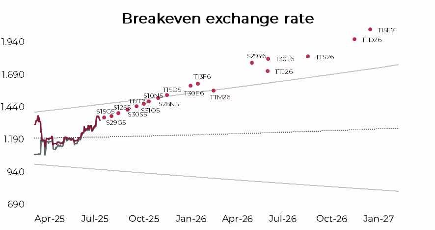 As shown in the chart, starting from the Boncap T15D5, the breakeven FX rate begins to exceed the upper bound of the FX band. This implies that, under the current FX regime, an investor acquiring this bond today and holding it to maturity on December 15 could achieve a direct USD return of at least 0.5% (1.4% NAR). Beyond that point, potential returns become increasingly attractive. For longer maturities, such as the T15E7—maturing in January 2027—the direct USD return rises to 17.4% (11.8% NAR), assuming the band regime remains in place and its mechanics unchanged. These returns could be even higher if the FX rate remains below the calculated breakeven level.