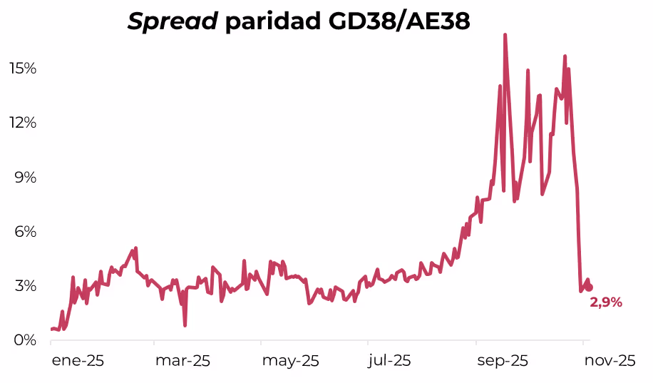 Mantenemos una visión constructiva sobre la deuda soberana en dólares, respaldada en los tres pilares fundamentales expuestos en nuestro informe Nuevo punto de partida. Desde la publicación de ese informe a finales de octubre, el AE38 registró una marcada compresión del spread de paridad frente al GD38 –de 8,4% a 2,9%–, reflejando una convergencia más consistente con el nivel actual de riesgo país y posicionándose como el bono de mejor desempeño en las últimas cinco ruedas.