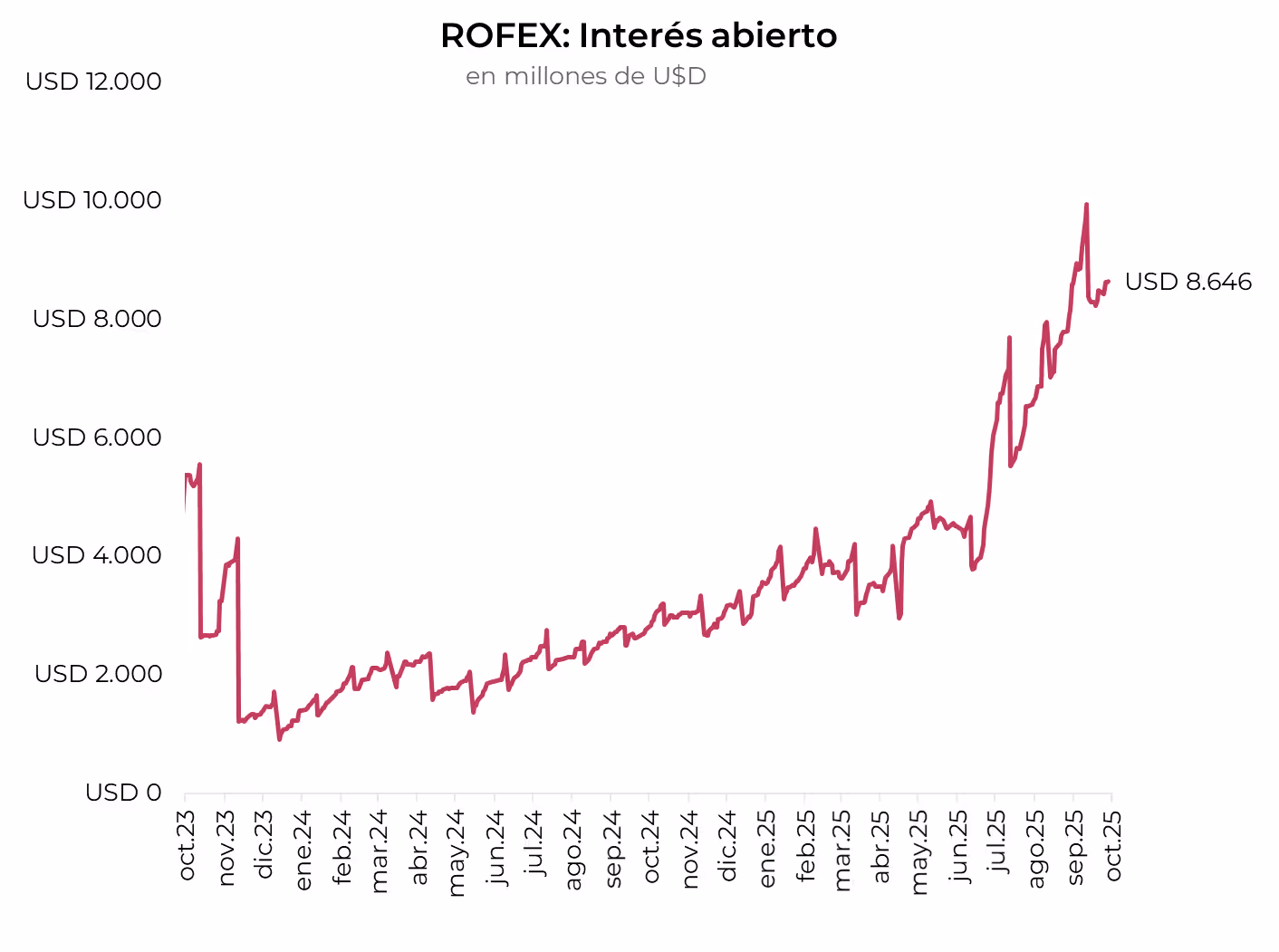 Asimismo, los futuros de dólar cayeron 1,1%, esta vez con incrementos tanto en volumen como en interés abierto. El volumen aumentó en USD 162 M, impulsado por el contrato de noviembre, mientras que el interés abierto subió en USD 23 M gracias al contrato de enero 2026. La TNA de octubre descendió a 19% y la de noviembre cerró en 40%.